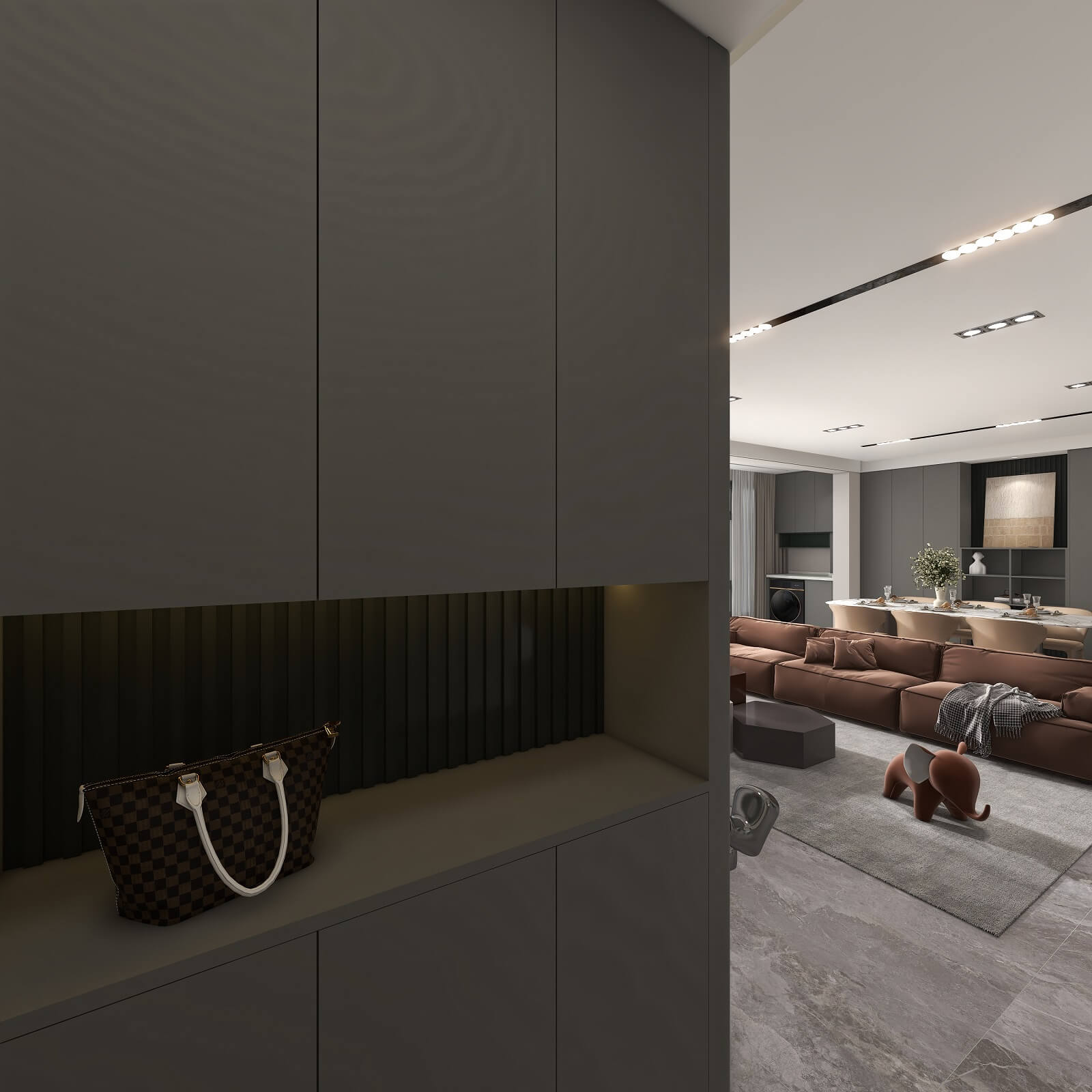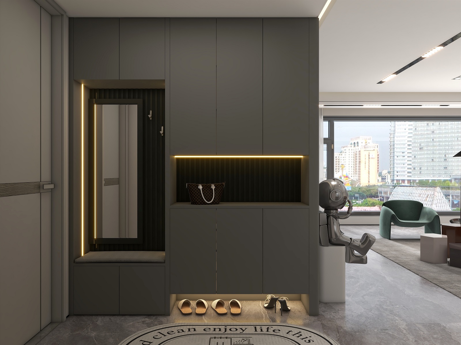 大面積運(yùn)用深灰色,格柵元素極具設(shè)計感,在層板燈的渲染下整個玄關(guān)輕奢有內(nèi)涵,給空間增添了幾分自然純粹的氣息,讓人身心放松。