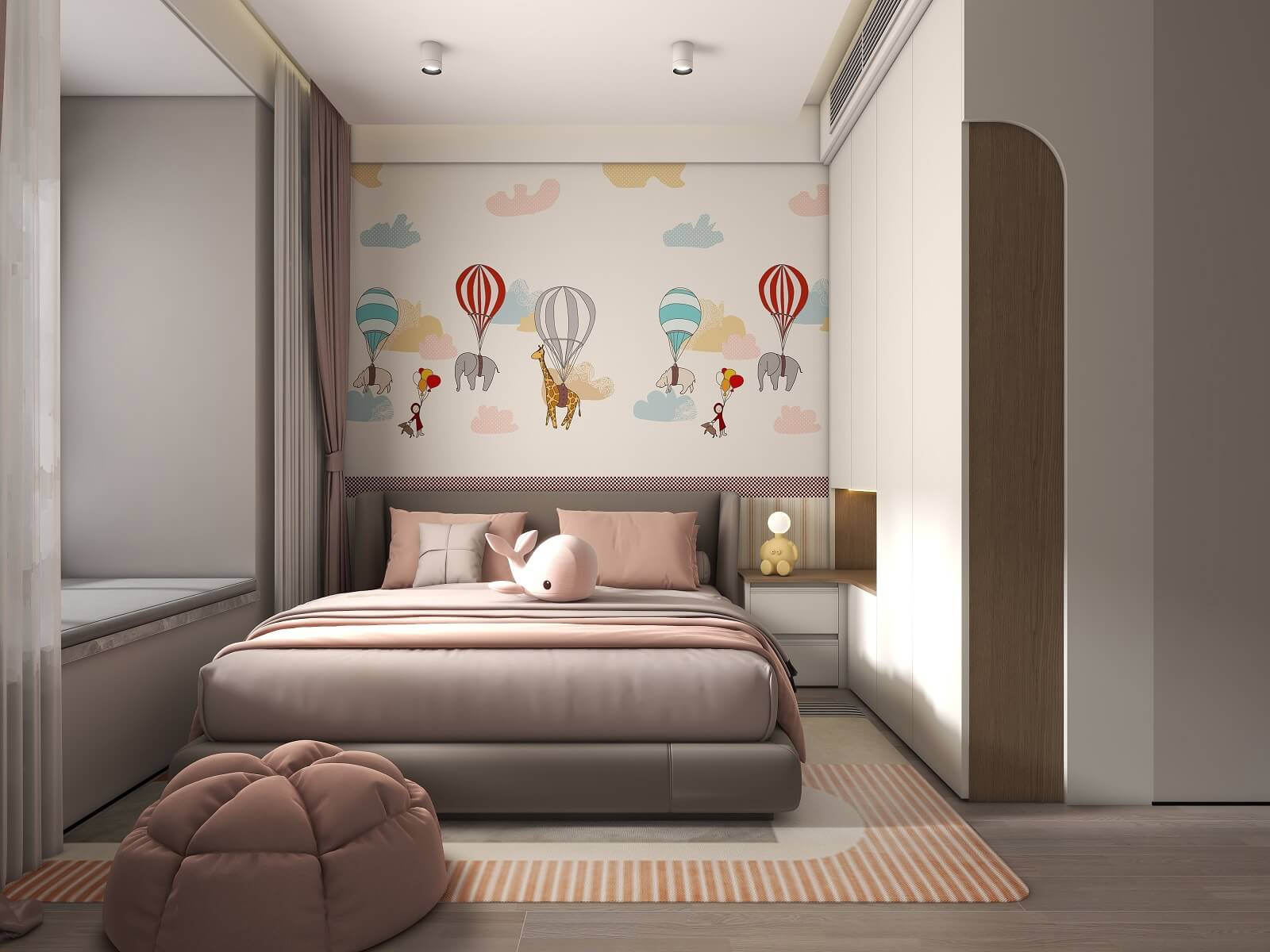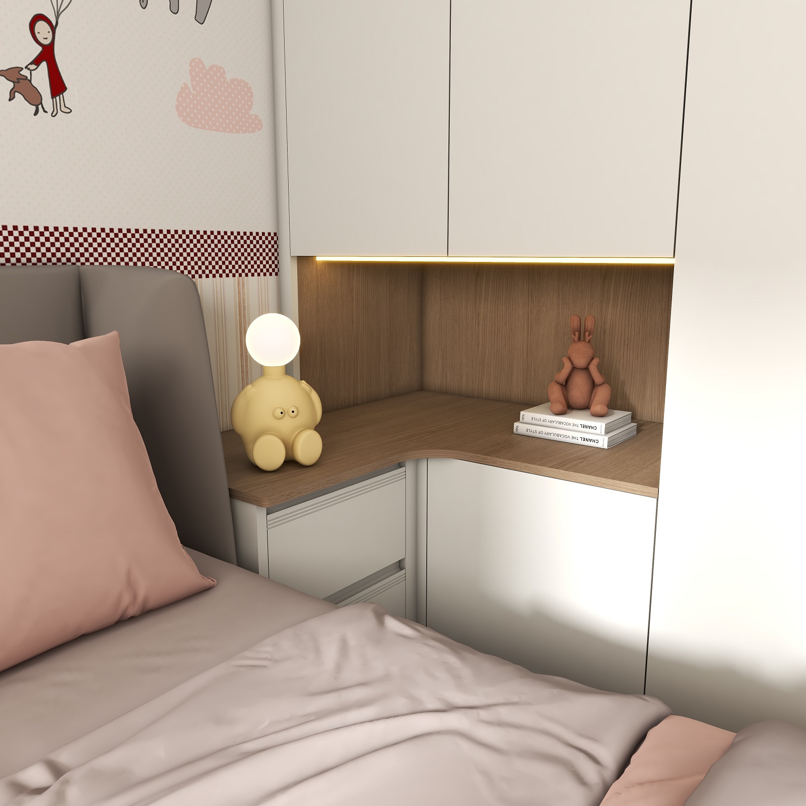 兒童房采用溫柔的奶白作為空間底色,整墻卡通貼畫搭配奶油白衣柜,在細(xì)節(jié)上用粉色裝飾作為跳色,無形中增加立體感和層次感,營造出童真舒適的兒童夢中情房。